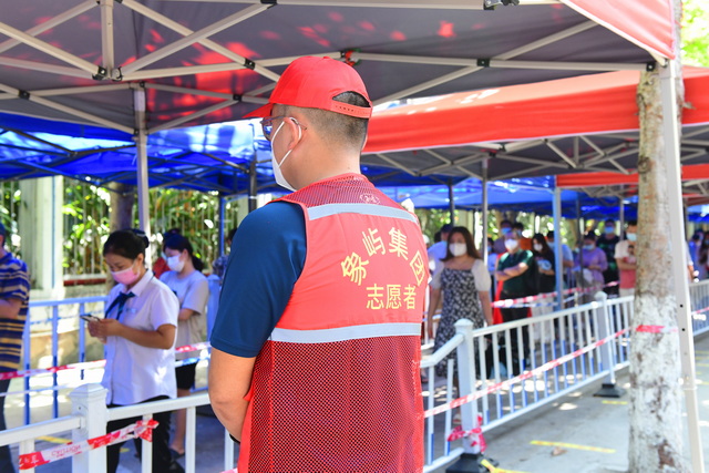 在湖里區(qū)興華社區(qū)核酸檢測點,黨旗紅、志愿紅、象嶼紅交相輝映。近30位象嶼集團志愿者頭頂烈日,盡心竭力做好隊伍秩序維護、查驗健康碼等工作,引導(dǎo)市民保持合理間距,安全有序檢測。