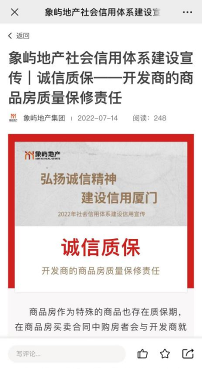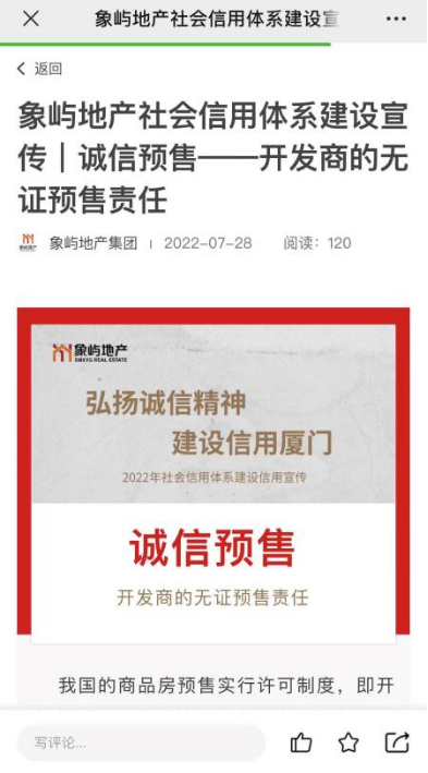 象嶼地產(chǎn)以報道誠信企業(yè)案例、倡導高品質產(chǎn)品和服務,弘揚全社會誠信典型的精神。同時,結合培育與踐行社會主義核心價值觀工作,象嶼集團不定期通過微社區(qū)發(fā)布誠信典型事跡,褒揚誠實守信的先進典型:象嶼創(chuàng)投組織員工進行《廈門市社會信用體系建設2022年工作要點》自行學習及廉潔從業(yè)書籍閱讀,提升員工對信用體系建設的理解;象嶼興泓公司組織先進分享業(yè)務及安全骨干心路分享活動,銷售副總對各業(yè)務部門業(yè)務開展情況進行點評,展現(xiàn)了象嶼集團引導廣大職工學習先進,發(fā)揮先進的示范引領帶動作用,為廈門這座全國文明典范城市創(chuàng)建助跑添力。