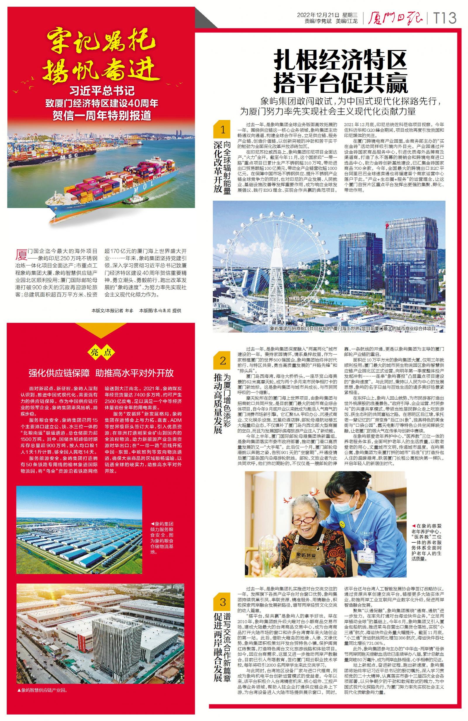 廈門國(guó)企迄今最大的海外項(xiàng)目——象嶼印尼250萬噸不銹鋼冶煉一體化項(xiàng)目全面達(dá)產(chǎn);市重點(diǎn)工程象嶼集團(tuán)大廈、象嶼智慧供應(yīng)鏈產(chǎn)業(yè)園北區(qū)順利投用;廈門國(guó)際郵輪母港打破900余天的沉寂再迎游輪旅客;總建筑面積超百萬方、投資超170億元的廈門海上世界盛大開業(yè)……一年來,象嶼集團(tuán)堅(jiān)持黨建引領(lǐng),深入學(xué)習(xí)貫徹習(xí)近平總書記致廈門經(jīng)濟(jì)特區(qū)建設(shè)40周年賀信重要精神,勇立潮頭、勇毅前行,跑出改革發(fā)展的“象嶼速度”,為努力率先實(shí)現(xiàn)社會(huì)主義現(xiàn)代化傾力作為。今天,廈門日?qǐng)?bào)推出特刊《牢記囑托 揚(yáng)帆奮進(jìn) 習(xí)近平總書記致廈門經(jīng)濟(jì)特區(qū)建設(shè)40周年賀信一周年特別報(bào)道》,現(xiàn)全文轉(zhuǎn)載如下。