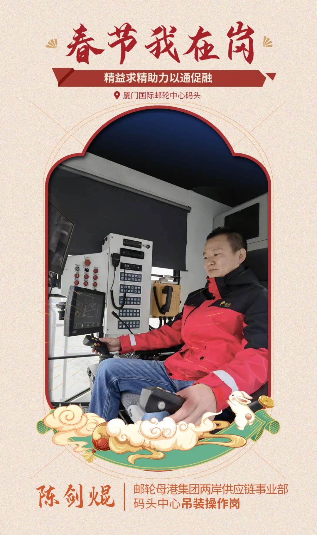 春節(jié)期間兩岸貨運(yùn)航線持續(xù)通航,陳劍焜堅(jiān)守崗位,操作流動(dòng)式起重機(jī)吊裝貨柜,以飽滿的工作熱情,保障兩岸間水路貨運(yùn)業(yè)務(wù)正常運(yùn)轉(zhuǎn),助力兩岸融合發(fā)展。