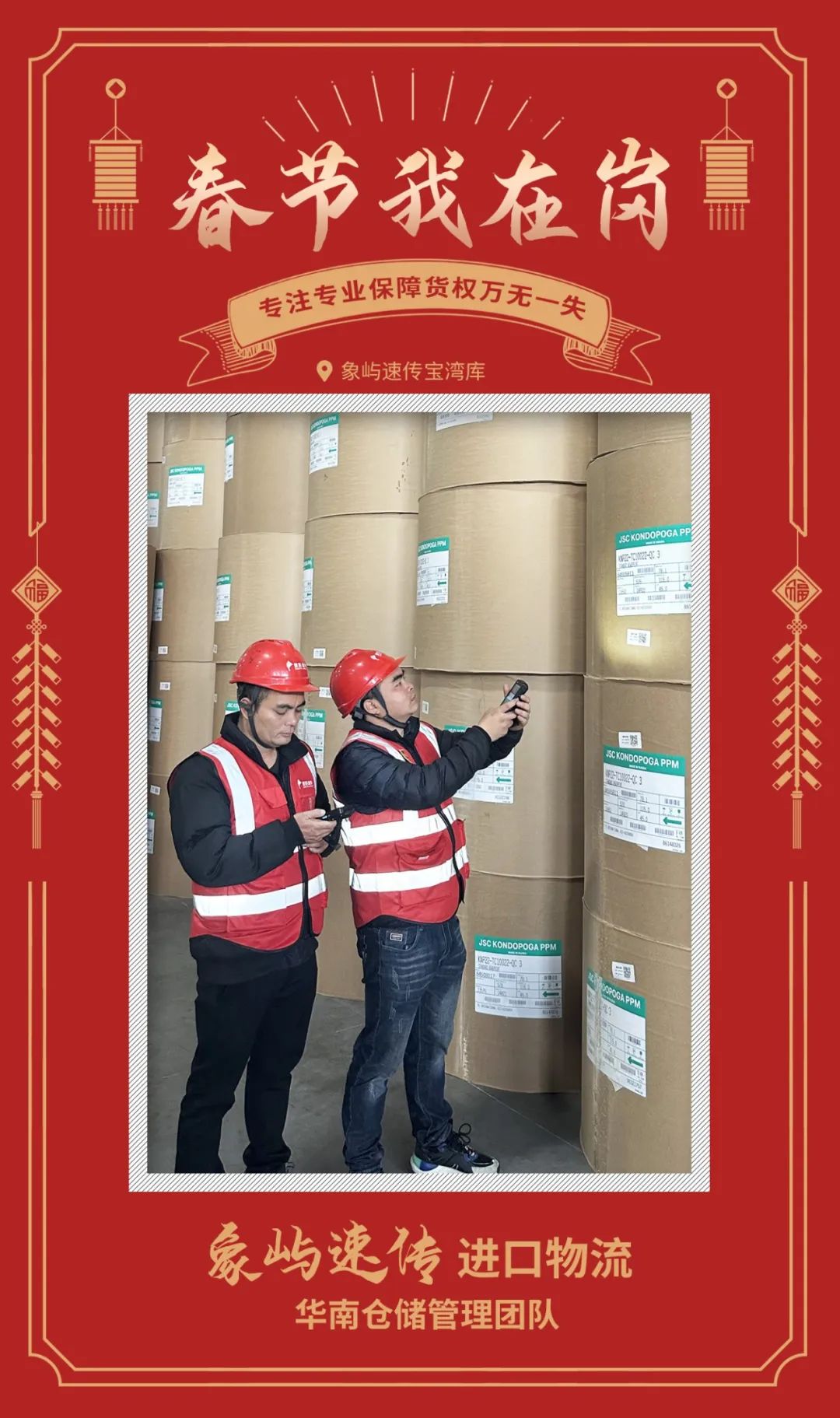 象嶼速傳寶灣庫(kù)是2023年新布局的重點(diǎn)倉(cāng)儲(chǔ)節(jié)點(diǎn),可為塑料、紙漿、農(nóng)產(chǎn)品等行業(yè)客戶提供倉(cāng)儲(chǔ)清關(guān)配送一體化、專業(yè)化物流服務(wù)。為確??蛻舴?wù)不斷檔、客戶貨權(quán)萬無一失,象嶼速傳進(jìn)口物流華南倉(cāng)儲(chǔ)管理團(tuán)隊(duì)春節(jié)期間全天候在崗。