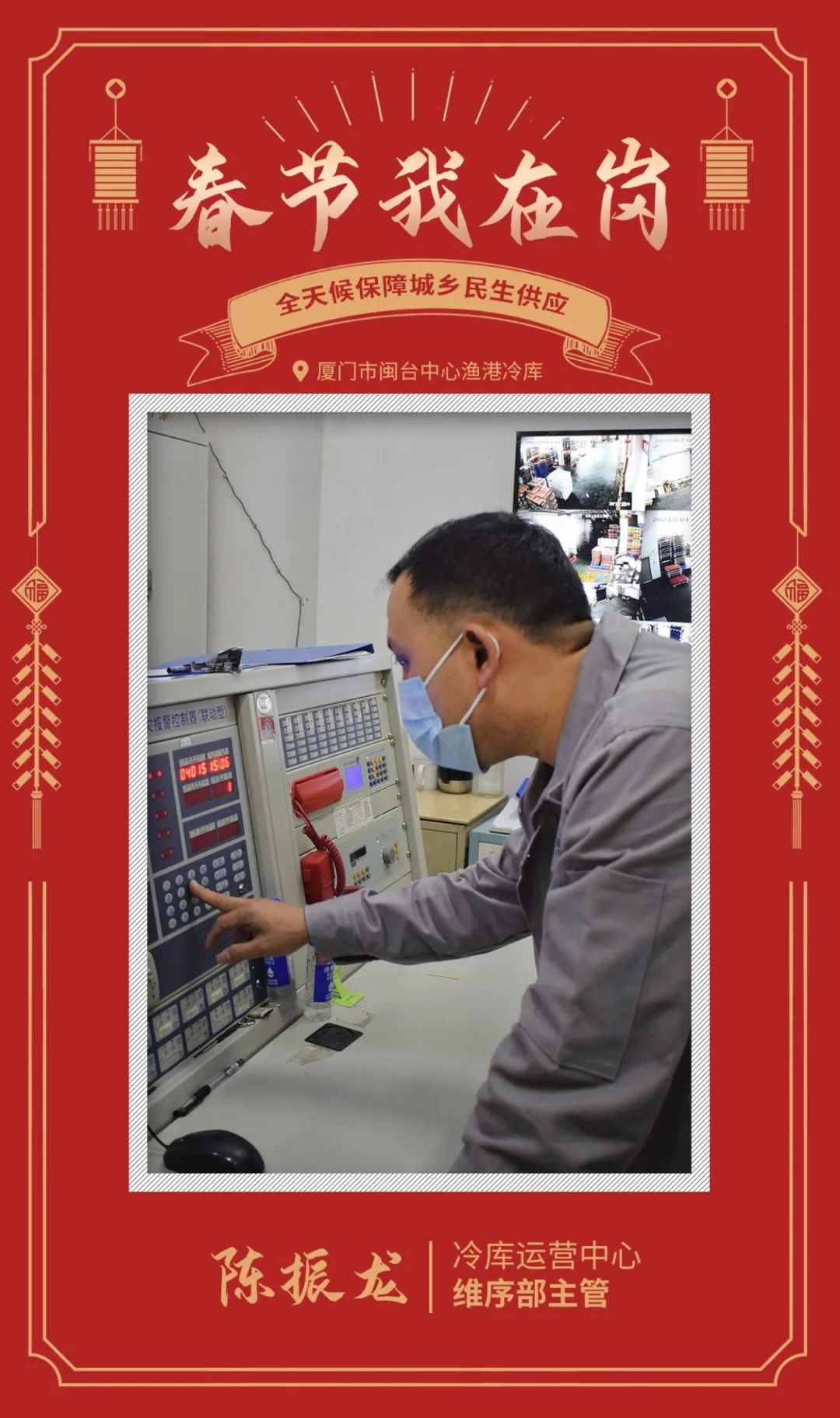 閩臺(tái)中心漁港冷庫(kù)(含超低溫冷庫(kù))項(xiàng)目為廈門市商務(wù)局“城鄉(xiāng)民生基礎(chǔ)設(shè)施”,并于2020年納入市重點(diǎn)物流項(xiàng)目,需要全年24小時(shí)全天候執(zhí)勤。春節(jié)期間,陳振龍堅(jiān)守崗位一線,確保冷庫(kù)運(yùn)營(yíng)中心消防系統(tǒng)、電系統(tǒng)設(shè)施設(shè)備安全運(yùn)行,協(xié)調(diào)包庫(kù)客戶合理分配裝卸平臺(tái),做好提、送貨車輛調(diào)度,為城鄉(xiāng)民生供應(yīng)鏈提供保障。