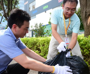 象嶼股份總經(jīng)理鄧啟東放下手頭繁忙事務,組織全體員工利用午休時間清理象嶼保稅區(qū)一期。象嶼集團旗下各公司經(jīng)營班子紛紛帶頭,示范作用感召越來越多的象嶼人積極參與進來。