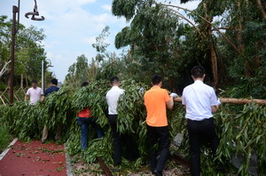 象嶼集團陳方副總裁、邵蕰默副書記、林俊杰副總裁等領(lǐng)導,上午奔波在島內(nèi)外察看災情,為了參與志愿服務,中午匆忙扒了兩口飯就趕回來,率先垂范,身穿志愿者紅馬甲,頭頂烈日,撿樹枝、清障礙,汗水濕透了衣衫。