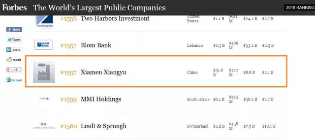 今日,美國《福布斯》雜志發(fā)布2018年“全球上市公司2000強(qiáng)”排行榜(Forbes Global 2000),廈門象嶼(600057)排名1557名,較去年躍升228位。