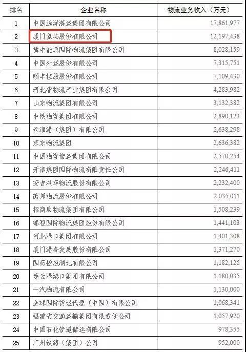 11月23日,中國物流與采購聯(lián)合會公布了2018年度中國物流企業(yè)50強(qiáng)排名,象嶼股份躍居第2,較上一年前進(jìn)兩位。