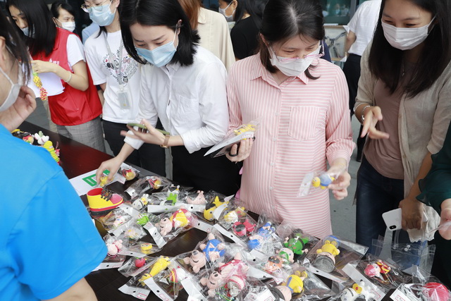 5月20日當天,國際航運中心涌動著愛的暖流。在自閉癥兒童藝術(shù)作品展覽義賣區(qū),“星寶”們制作的各式可愛公仔和創(chuàng)意畫作吸引了不少象嶼員工和過路市民駐足圍觀。