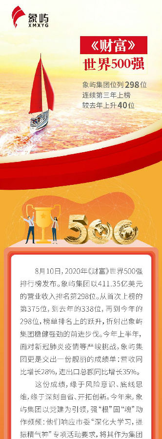 298位!前進(jìn)40名,象嶼集團連續(xù)三年上榜《財富》世界500強