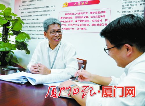 象嶼股份黨委副書記、副總經理齊衛(wèi)東(左)跟員工探討項目落實情況。(《廈門日報》記者黃曉珍攝)