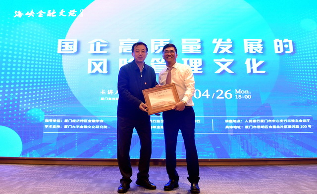 4月26日下午,應廈門經濟特區(qū)金融學會的邀請,象嶼集團黨委書記、董事長張水利站上“海峽金融文苑”的講壇,面向全市百余家金融機構負責人,做《國企高質量發(fā)展的風險管理文化》專題分享。中國人民銀行廈門市中心支行行長、廈門經濟特區(qū)金融學會會長王彥青出席講座,并為張水利董事長頒發(fā)感謝狀。本次活動由廈門經濟特區(qū)金融學會指導、廈門大學金融文化研究院提供學術支持、中國銀行廈門市分行主辦。中國銀行廈門市分行副行長陳顥主持講座。