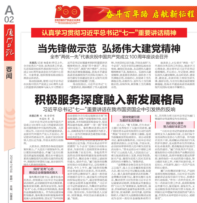 7月5日,《廈門日報》以《積極服務(wù)深度融入新發(fā)展格局》為題,報道我市國資國企系統(tǒng)學(xué)習貫徹情況,突出報道了象嶼集團黨委書記、董事長張水利的學(xué)習心得。