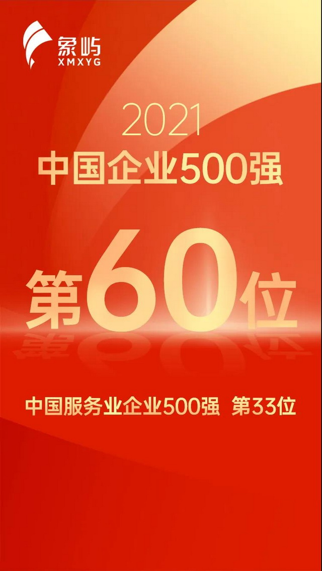 9月25日,中國企業(yè)聯(lián)合會(huì)、中國企業(yè)家協(xié)會(huì)發(fā)布2021年中國企業(yè)500強(qiáng)榜單,象嶼集團(tuán)以37483544萬元人民幣的營收排名第60位,較去年前進(jìn)17位;在同期發(fā)布的“2021年中國服務(wù)業(yè)企業(yè)500強(qiáng)”中,象嶼集團(tuán)位列第33位,較去年前進(jìn)10位。自2007年參評(píng)榜單以來,象嶼集團(tuán)已連續(xù)15年登榜,排名年年躍升。