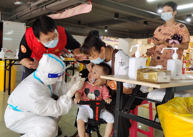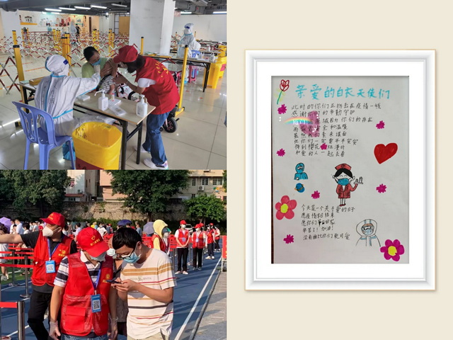 來自象嶼速傳黨辦的禇穎與她愛人齊上陣,兩人錯(cuò)開時(shí)間進(jìn)行志愿服務(wù),一人在外幫助市民進(jìn)行核酸檢測,一人在家照顧孩子,既顧好“小家”也顧著“大家”。