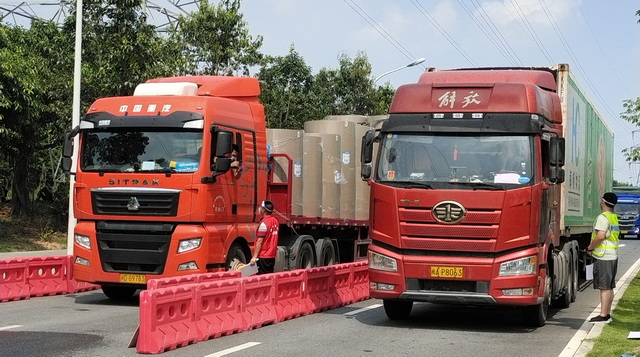 三個(gè)班次里,最難熬的是中午11點(diǎn)到下午4點(diǎn)。烈日當(dāng)空,公路上無遮無攔,地面溫度達(dá)到40度以上。大貨車行駛時(shí),熱浪和尾氣撲面而來。想喘口氣,臉上還被N95口罩和防護(hù)面罩捂得嚴(yán)嚴(yán)實(shí)實(shí)。但志愿者們依舊牢牢釘在崗位上,20分鐘一班,交替上崗/休息。