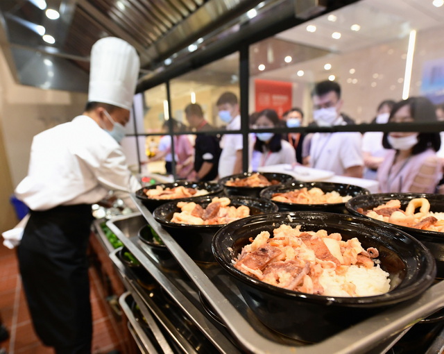 它美在菜品豐富。餐廳設(shè)置自助餐區(qū)、健康輕食區(qū)和四個(gè)特色檔口,每餐供應(yīng)菜品20余款,涵蓋煲仔飯、手工拉面、西餐、特色小吃以及各地口味餐食,做到一周菜品不重復(fù),每周至少推出一款新菜。