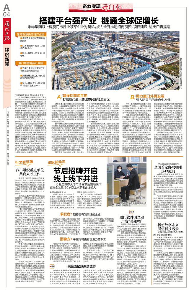 近年來(lái),廈門(mén)跨境電商產(chǎn)業(yè)園堅(jiān)持頂層設(shè)計(jì)、圈層構(gòu)筑、鏈條打造三位一體,成功吸引亞馬遜全球開(kāi)店項(xiàng)目、Shopee跨境電商孵化中心,新引入阿里巴巴電商生態(tài)鏈,招商運(yùn)營(yíng)再次取得新突破,累計(jì)注冊(cè)企業(yè)達(dá)825家,招商引資超37億元。園區(qū)入選工信部“國(guó)家小微雙創(chuàng)示范基地”和商務(wù)部“國(guó)家電子商務(wù)示范基地”,形成雙國(guó)家基地支撐格局。去年圍繞服務(wù)金磚創(chuàng)新基地建設(shè),園區(qū)引入南非進(jìn)口商品交流中心、俄羅斯商品展示中心等,打造金磚國(guó)家跨境電商綜合服務(wù)中心。同時(shí),象嶼集團(tuán)的海外業(yè)務(wù)布局及在金屬礦產(chǎn)、能源化工、農(nóng)產(chǎn)品等傳統(tǒng)優(yōu)勢(shì)領(lǐng)域和新能源等新興板塊的持續(xù)發(fā)力,也帶動(dòng)集團(tuán)在廈進(jìn)出口、批發(fā)零售等指標(biāo)強(qiáng)勁增長(zhǎng)?;⒛暌潦迹髱Z股份船舶事業(yè)部就迎來(lái)6艘散貨船出口訂造訂單,并順利交付國(guó)外客戶2艘船舶,喜迎“開(kāi)門(mén)紅”。