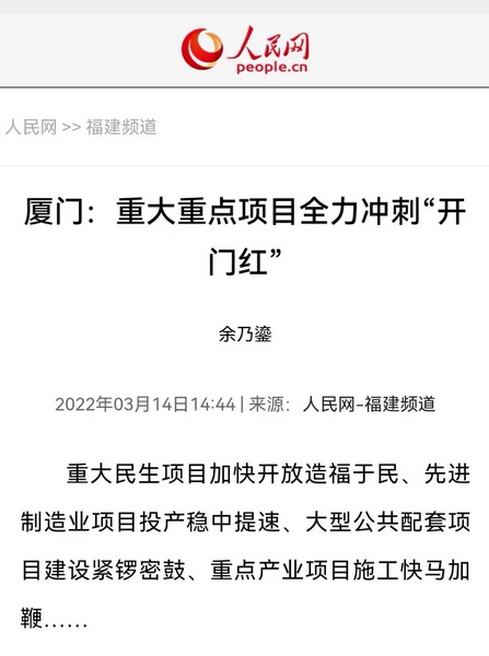 新華社以《廈門:一季度各重大項目平穩(wěn)運行》為題,報道象嶼人今年的“快節(jié)奏”。