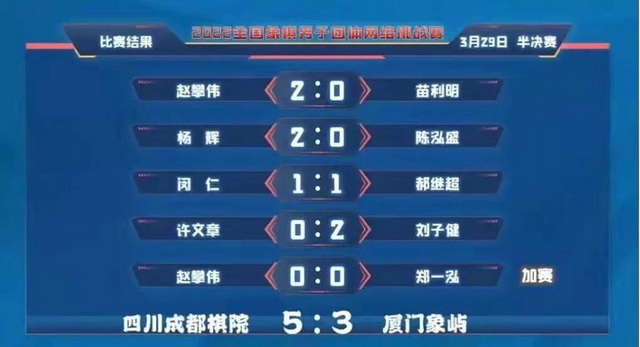 今年廈門象嶼象棋隊(duì)看點(diǎn)豐富,鄭一泓特大繼續(xù)領(lǐng)銜,團(tuán)隊(duì)幾位大將都是棋壇屈指可數(shù)的風(fēng)云人物,還大手筆引進(jìn)“東北虎”趙國(guó)榮特大和“98黃金一代”劉子健大師。陣容調(diào)整后的廈門象嶼象棋隊(duì),此次在過關(guān)斬將中充分磨合團(tuán)隊(duì)、調(diào)整戰(zhàn)術(shù),3月27日以6:2戰(zhàn)勝奪得過全運(yùn)會(huì)、智運(yùn)會(huì)團(tuán)體冠軍的浙江隊(duì),晉級(jí)四強(qiáng);昨日半決賽,又與象甲聯(lián)賽三屆衛(wèi)冕冠軍四川隊(duì)幾番廝殺,互有勝負(fù),最終以3:5惜敗。至此,廈門象嶼象棋隊(duì)取得本次團(tuán)體網(wǎng)絡(luò)挑戰(zhàn)賽并列第三名的佳績(jī)。中國(guó)象棋協(xié)會(huì)在戰(zhàn)報(bào)中評(píng)價(jià)道,“鄭一泓特大領(lǐng)銜的廈門象嶼隊(duì)今年或許會(huì)成為一支不可忽視的力量,讓我們拭目以待。”