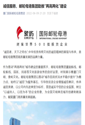 象嶼集團旗下郵輪母港集團立足郵輪母港集團文化、為廣大市民、游客提供旅游服務(wù)的窗口特性,積極開展“集案例、樹典型”誠信宣傳活動,征集挖掘誠信服務(wù)故事,“輪渡公司的完璧歸趙”“碧海紅帆公司的信守不渝”“象嶼發(fā)展公司的拾金不昧”等一系列誠信故事涌現(xiàn)出來,在各大微信公眾號平臺廣為宣傳,展現(xiàn)了象嶼集團服務(wù)市民、游客的誠心與用心,為廈門這座全國文明典范城市創(chuàng)建助跑添力。