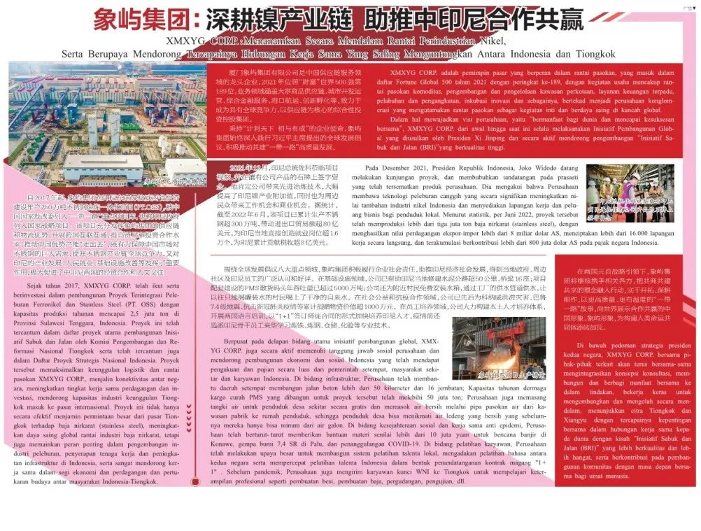 昨天,商務部《國際商報》以《象嶼集團:深耕鎳產業(yè)鏈 助推中印尼合作共贏》為題刊發(fā)專題報道,介紹象嶼集團在印尼投資建設年產250萬噸不銹鋼冶煉一體化項目,推動高質量共建“一帶一路”,促進中印尼兩國經貿合作和人文交往的突出成效。